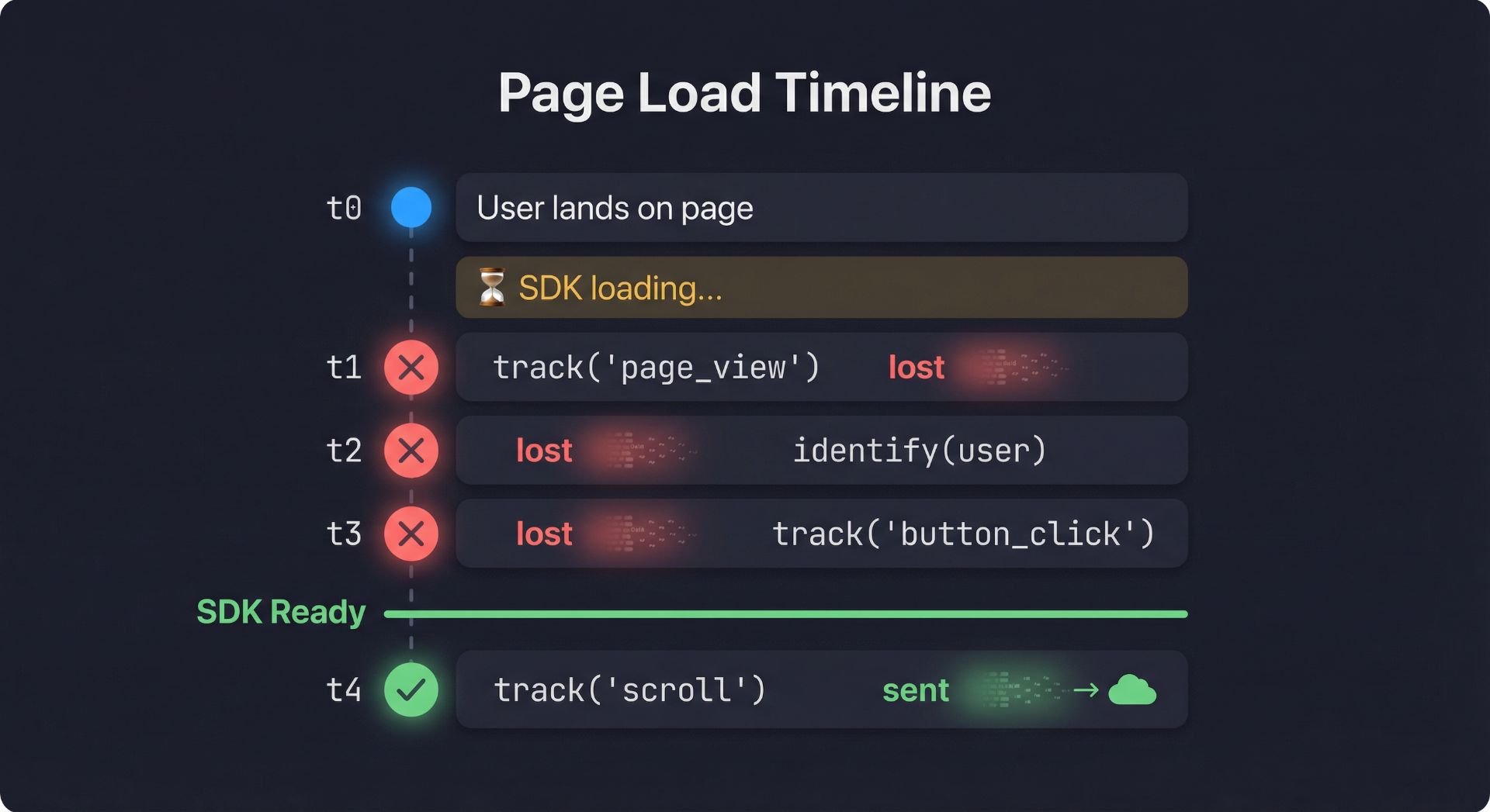 | Timeout fallback for reliability | Events stay in buffer forever if SDK never loads and timeout check fails |